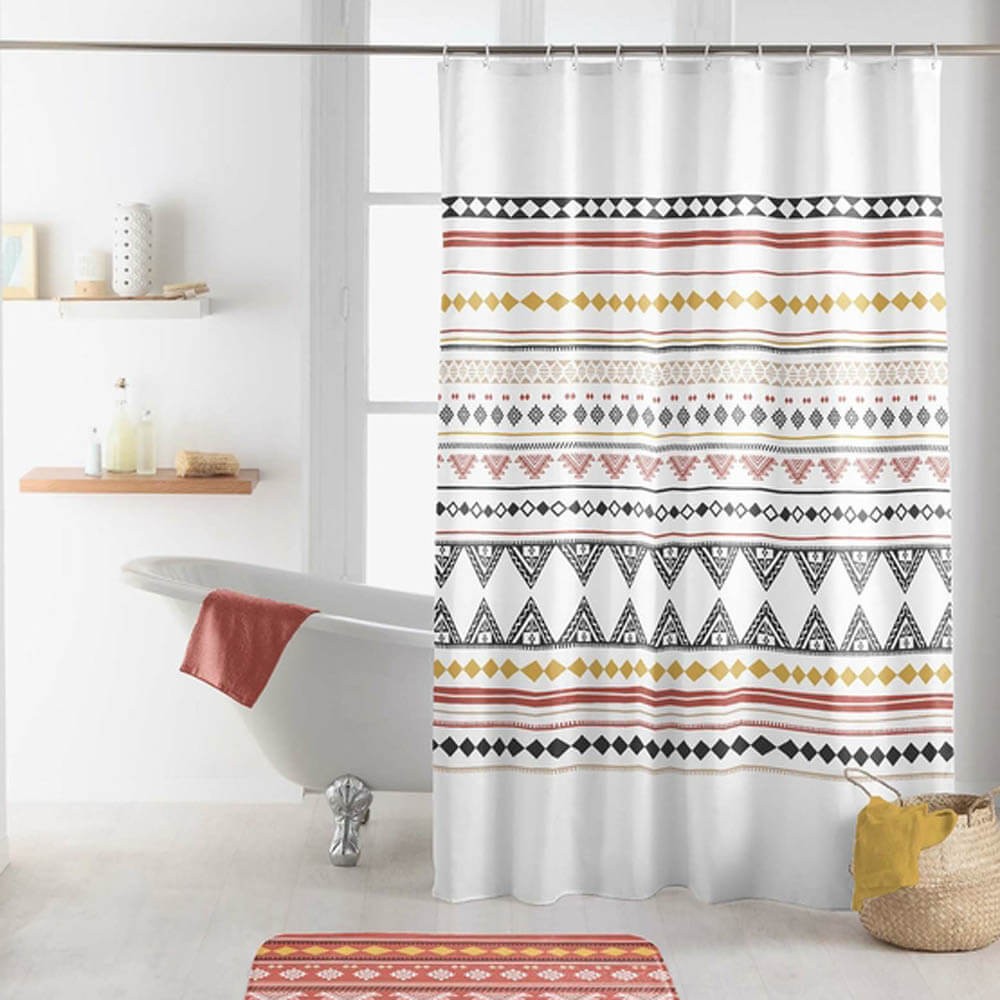 Cortina de baño diseño étnico confeccionada en tejido de poliéster con estampado geométrico de triángulos en color mostaza, negro y terracota, cuenta con tratamiento repelente e impermeable, ideal para colocar en la ducha o bañera y evitar que el agua salpique el suelo del baño.