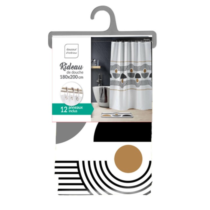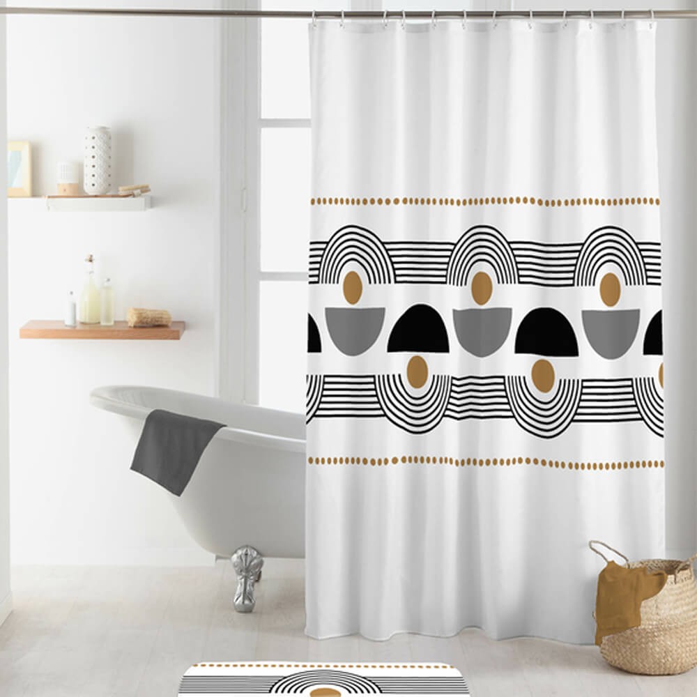 Renueva de forma rápida y económica la decoración de tu cuarto de baño con esta cortina de ducha realizada en poliéster estampado. Su diseño moderno presenta un atractivo estampado geométrico de semi círculos negros y grises sobre fondo blanco, agregando un toque de estilo contemporáneo a tu espacio.