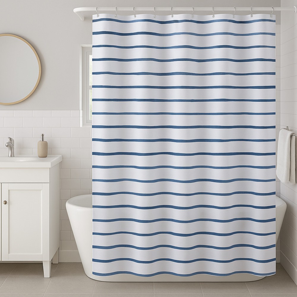 Renueva tu baño con esta cortina de ducha Rayas Marineras Azul de 180x200 cm. Su estampado de líneas horizontales en azul sobre fondo blanco aporta un estilo fresco, actual y muy versátil, perfecto para crear un ambiente relajante con inspiración náutica.