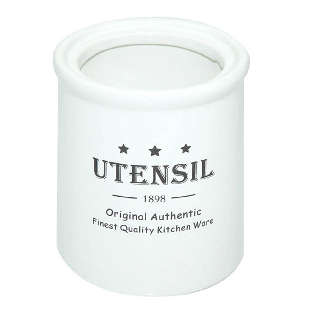 Vaso porta utensilios de cocina realizado en cerámica blanca decorada con 3 estrellas y la palabra Utensil en color negro, funcional y decorativo, muy práctico para tener a mano y cerca de los fuegos los utensilios de cocina de mas uso, cucharas, palas, lenguas, batidores, etc.