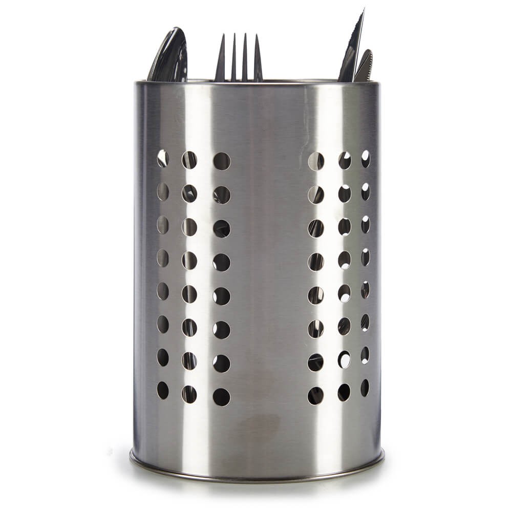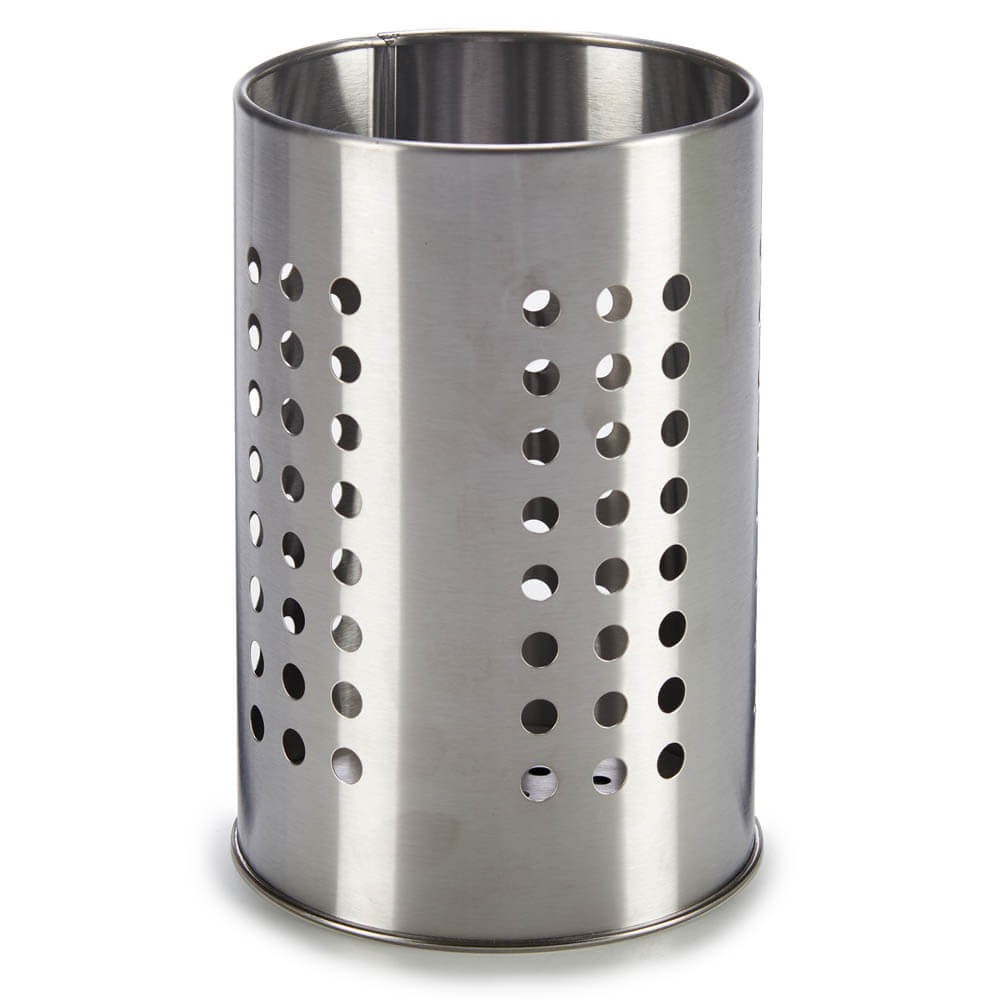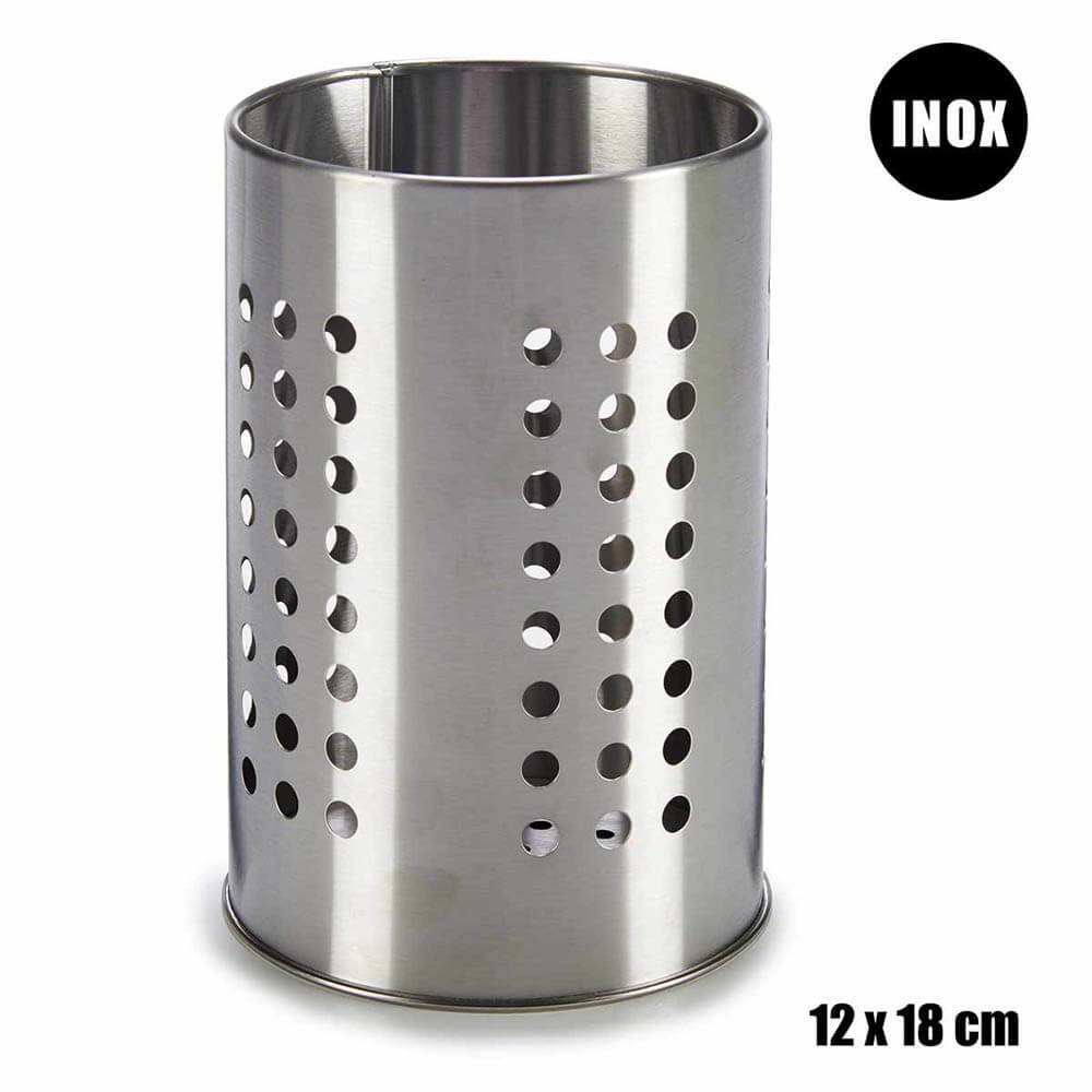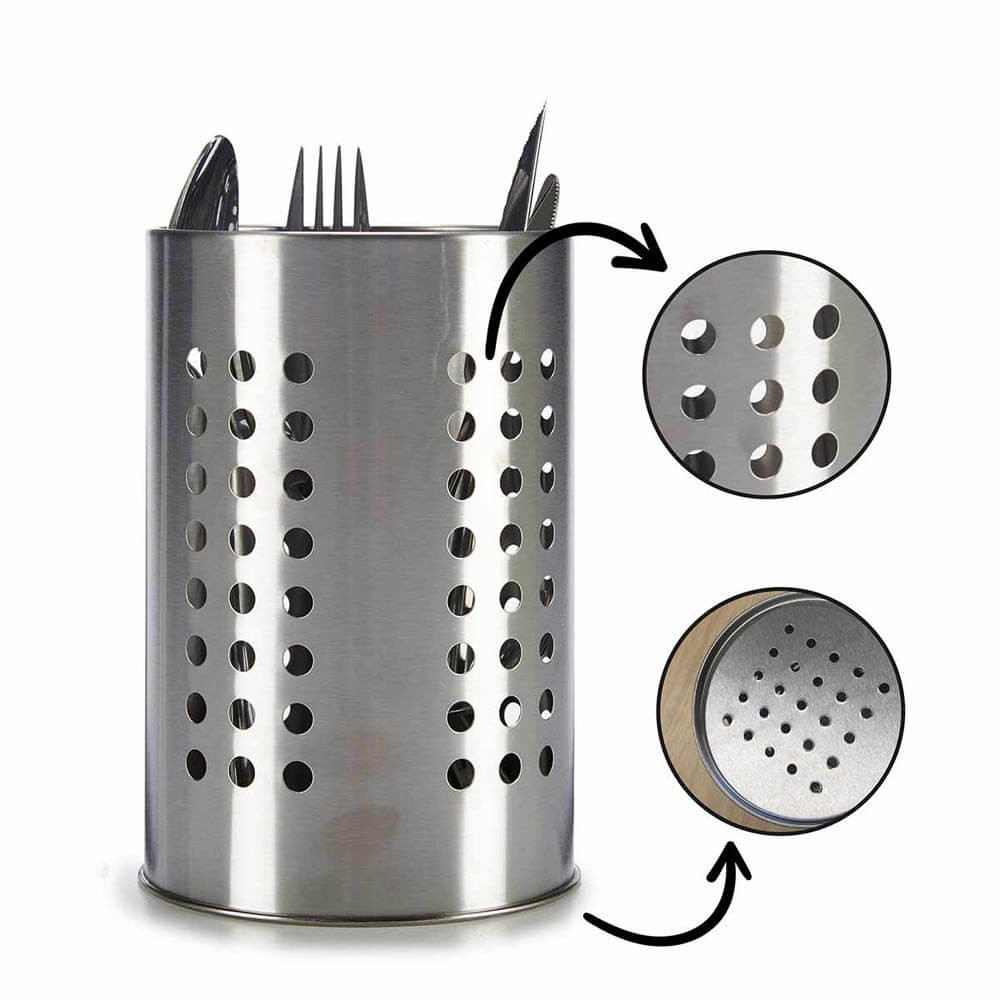 Cubertero de acero inoxidable con agujeros de drenaje, ideal para secar cubiertos y utensilios de cocina. Dimensiones: 12 x 12 x 17,6 cm.
