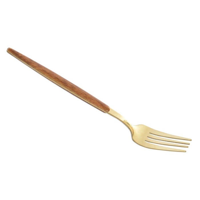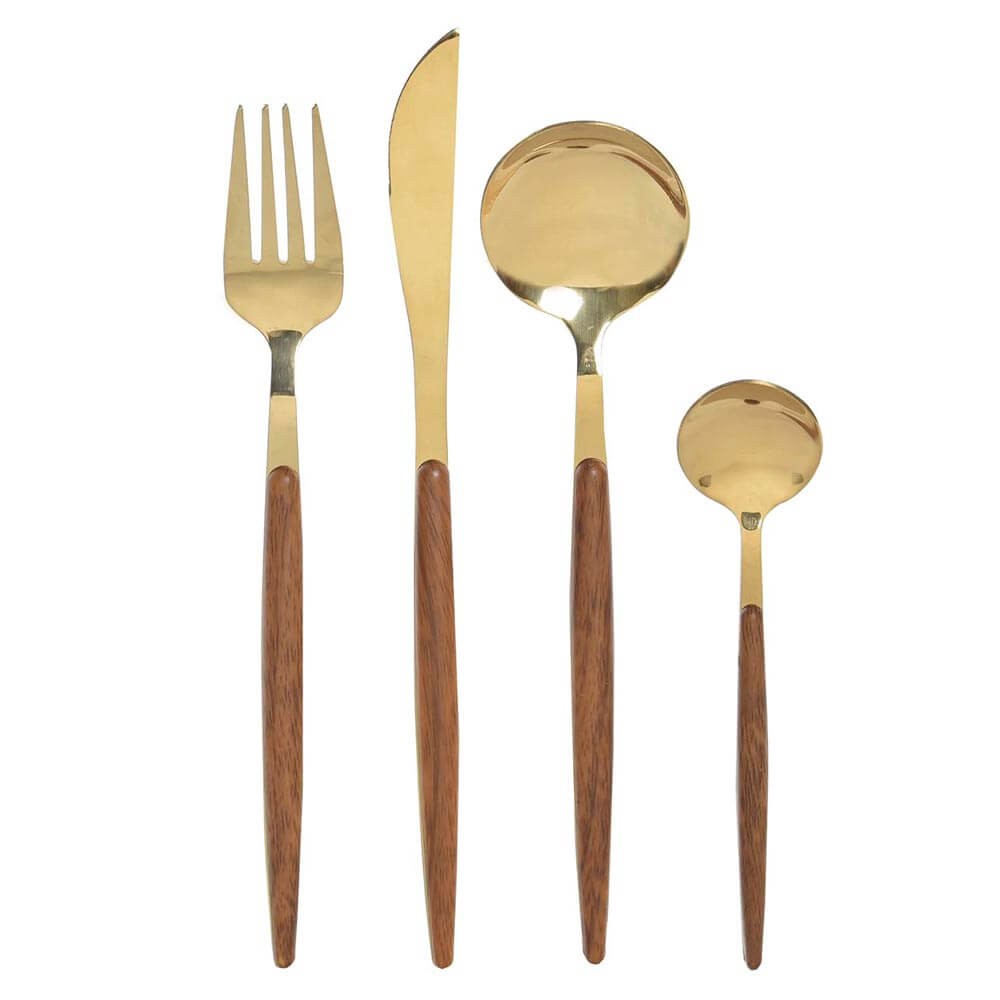 Esta cubertería dorada realizada en acero inox con mango de madera es el toque perfecto para que montes hermosas mesas para sorprender a tus familiares y amigos en fiestas y reuniones.