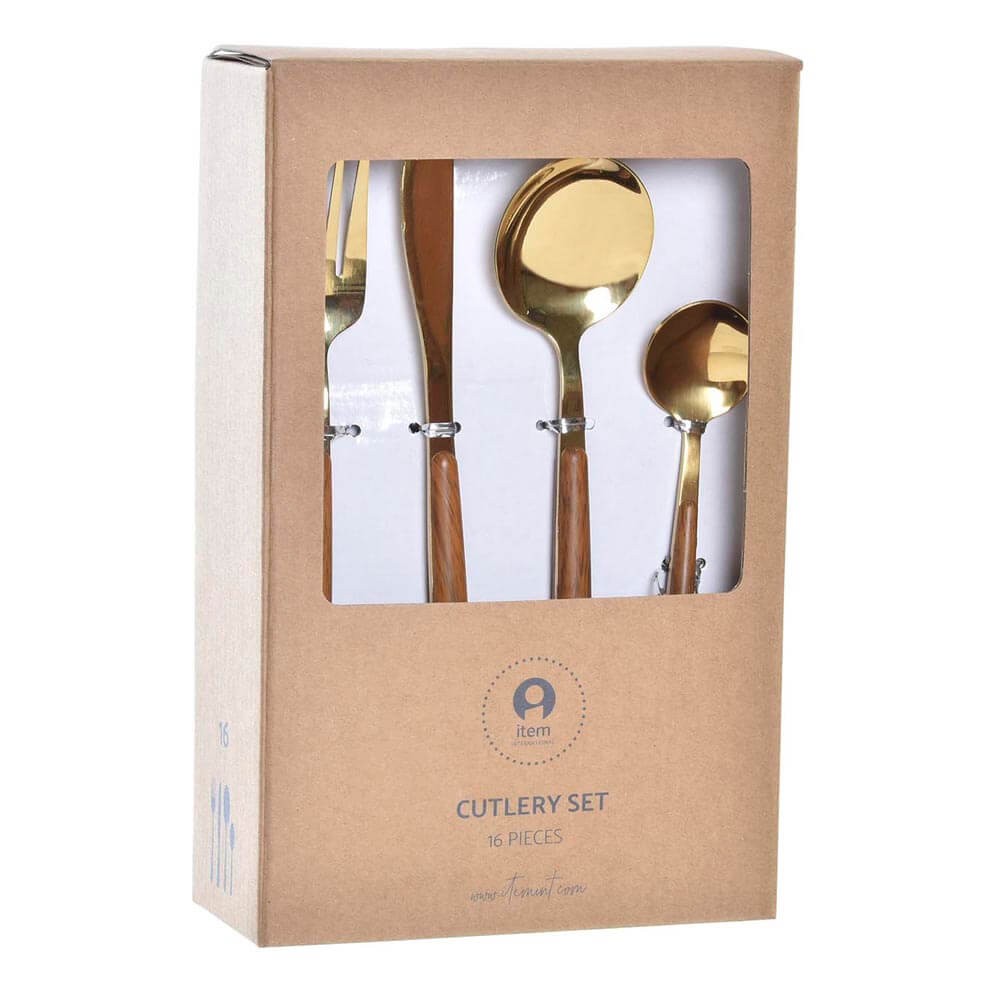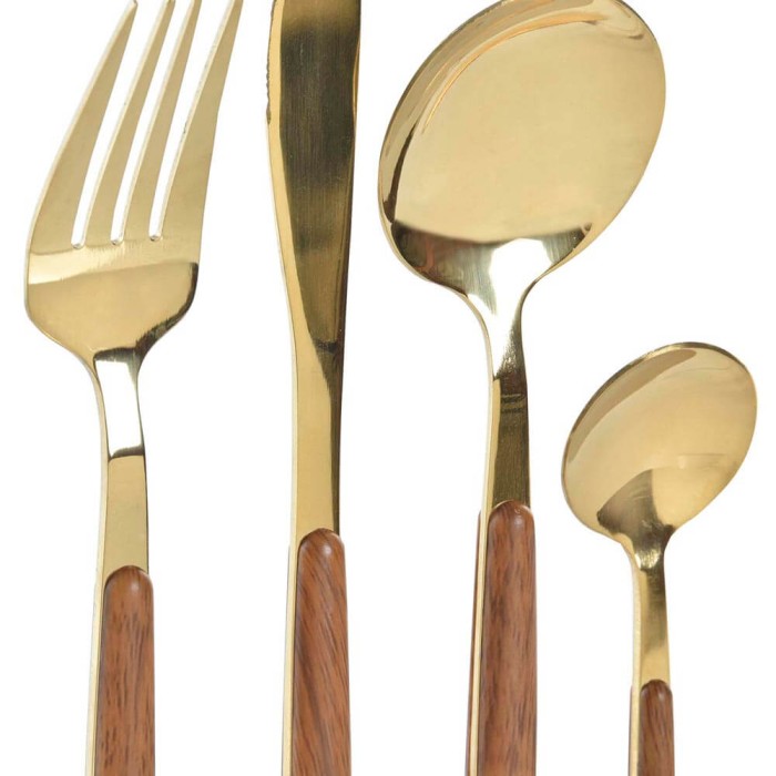 Una cuberteria sofisticada y elegante con la que darás a tu mesa un toque glamuroso y cálido gracias al color dorado y al mango de madera.
