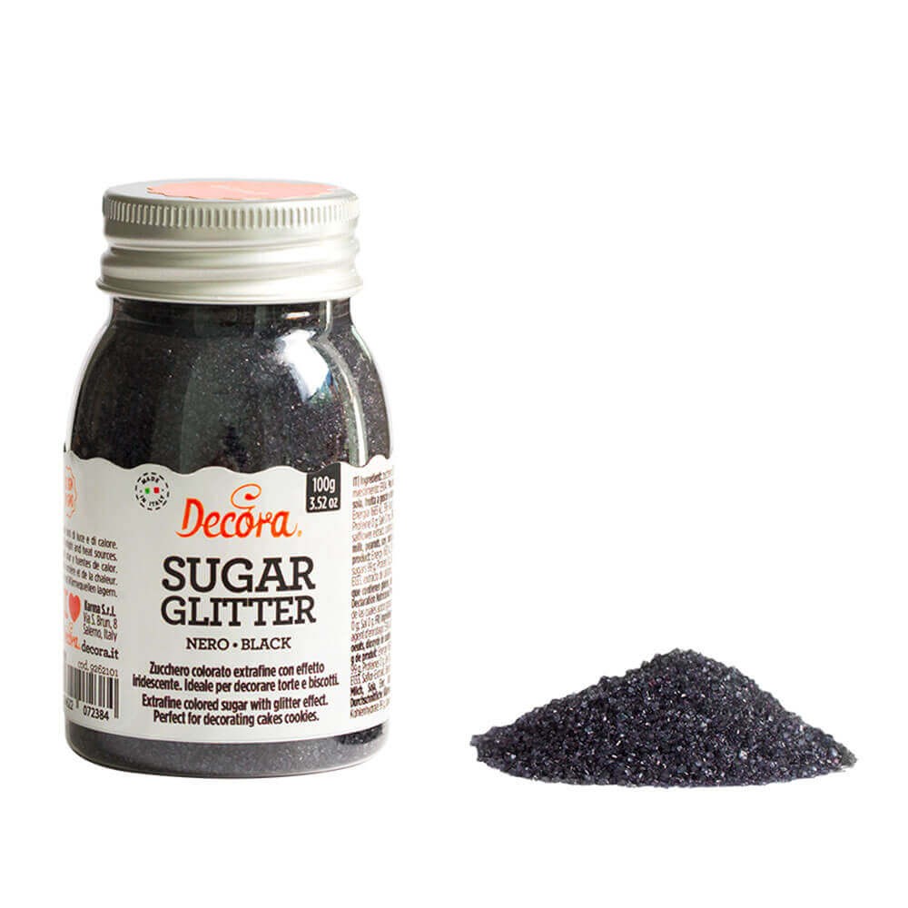 Azúcar negro brillante e intenso de la marca Decora realizado con colorantes extraídos naturalmente, perfecto para decoraciones dulces de tartas, galletas, para hacer el centro de una flor, etc.