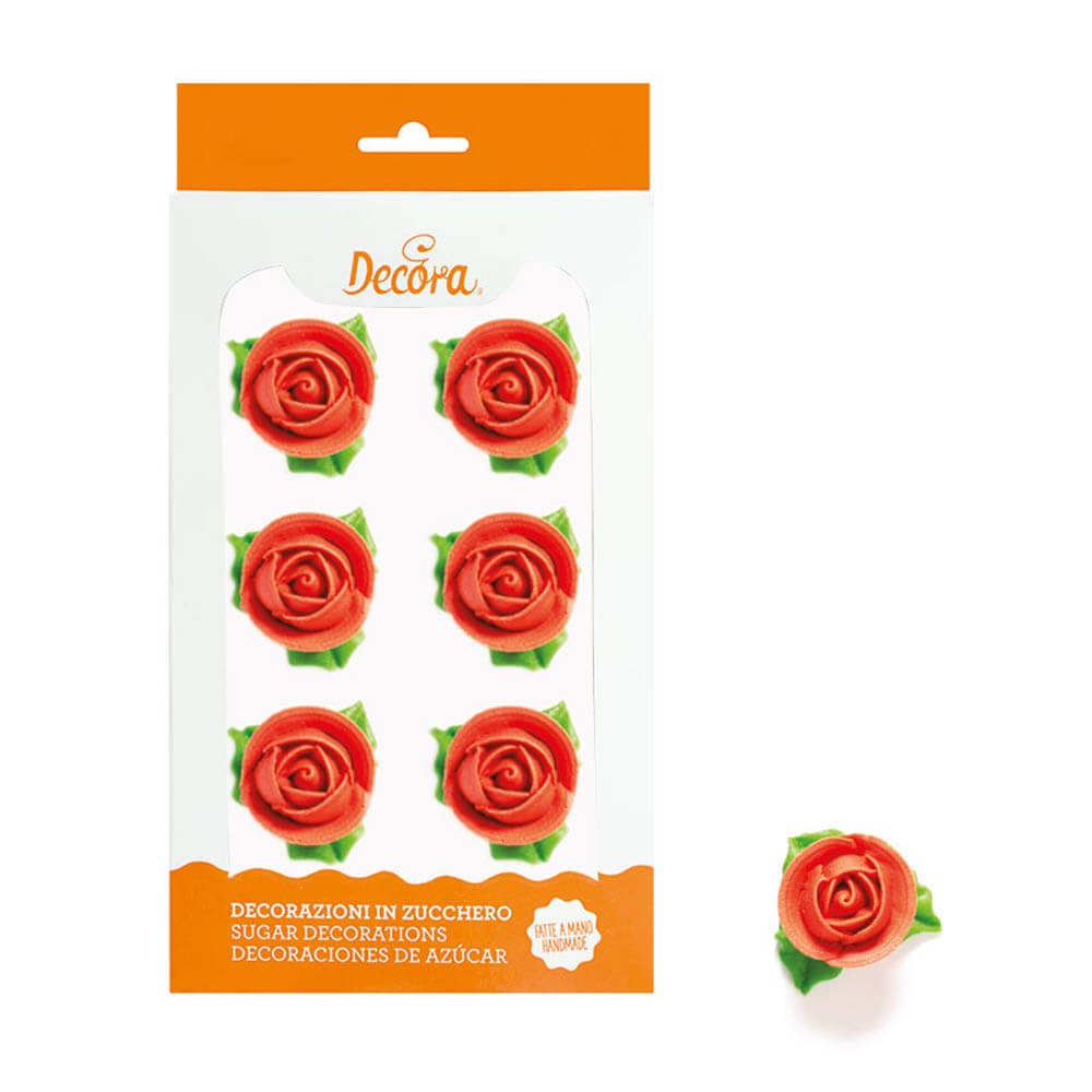 Decoraciones de azúcar listas para usar en forma de rosas rojas. Las flores de azúcar están hechas a mano con tintes de extracción natural. Perfectas para decorar tartas, cupcakes, galletas y demás dulces con facilidad.