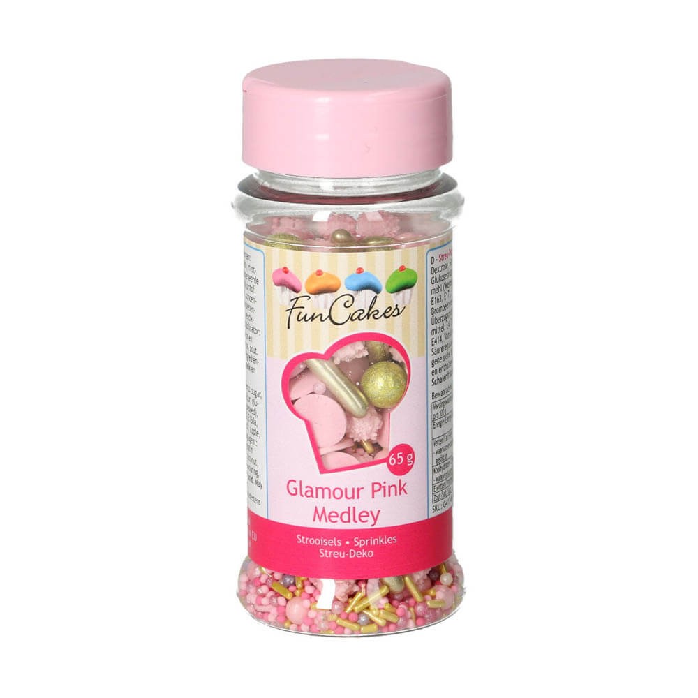El FunCakes Sprinkle Medley glamour pink es un mix que incluye conffetti, nonpareils, jimmies, perlas y mucho más en colores dorados y rosas. ¡No solo se ven bien, sino que también saben muy bien!