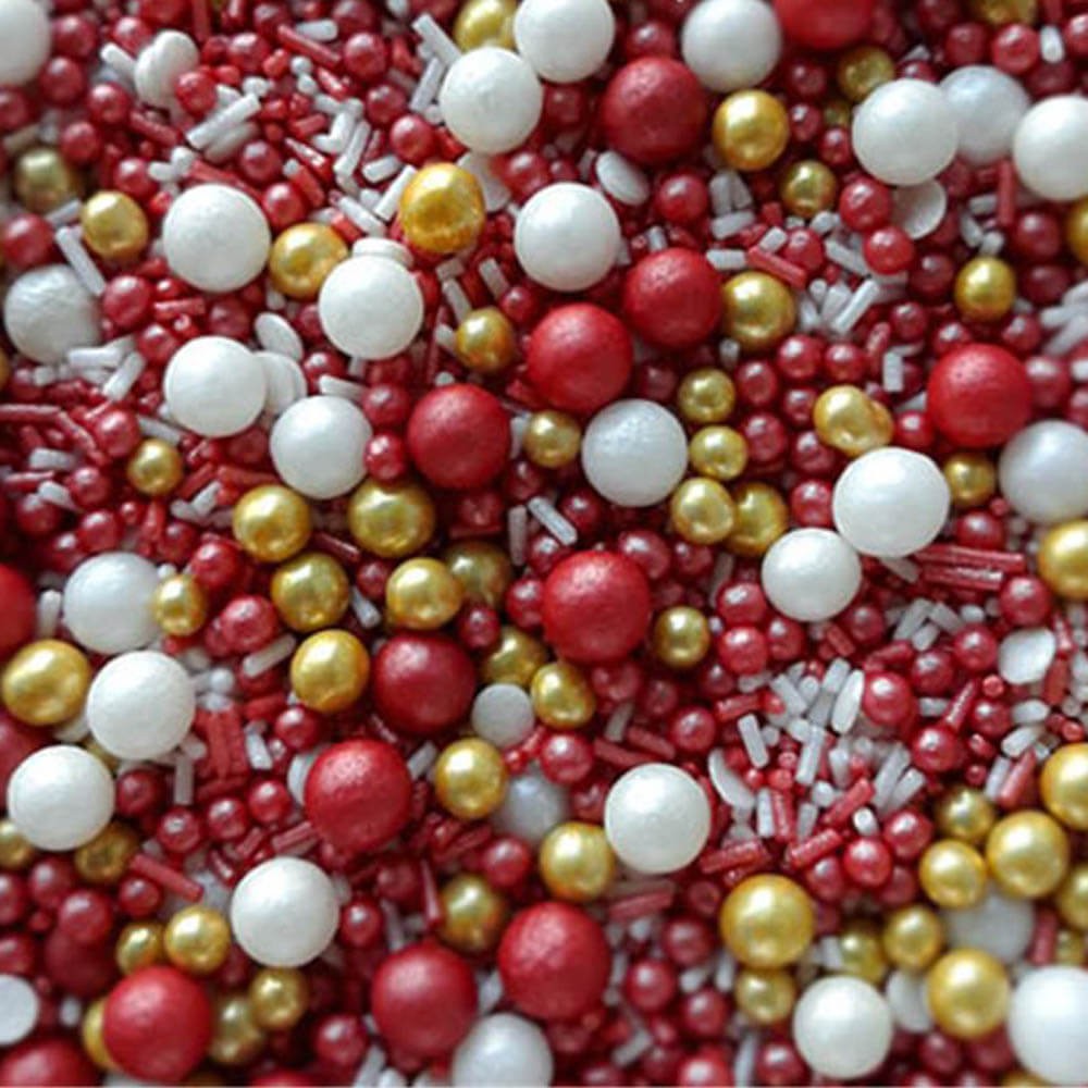 Sprinkles de azúcar en color rojo, blanco y dorado compuesto por fideos, perlas y confetti. Esta mezcla de figuras de azúcar es ideal para decorar de forma rápida y sencilla tartas, cupcakes, magdalenas, helados, galletas, y demás dulces. Conseguirás dar un toque sorprendente a tus elaboraciones en tan solo unos segundos.