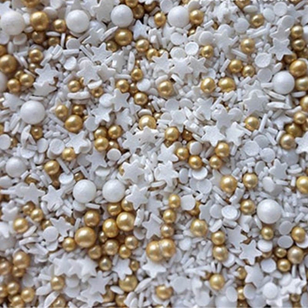 Sprinkles de azúcar en color oro y blanco compuesto por fideos, perlas, confetti y estrellas. Esta mezcla de figuras de azúcar es ideal para decorar de forma rápida y sencilla tartas, cupcakes, magdalenas, helados, galletas, y demás dulces. Conseguirás dar un toque sorprendente a tus elaboraciones en tan solo unos segundos.