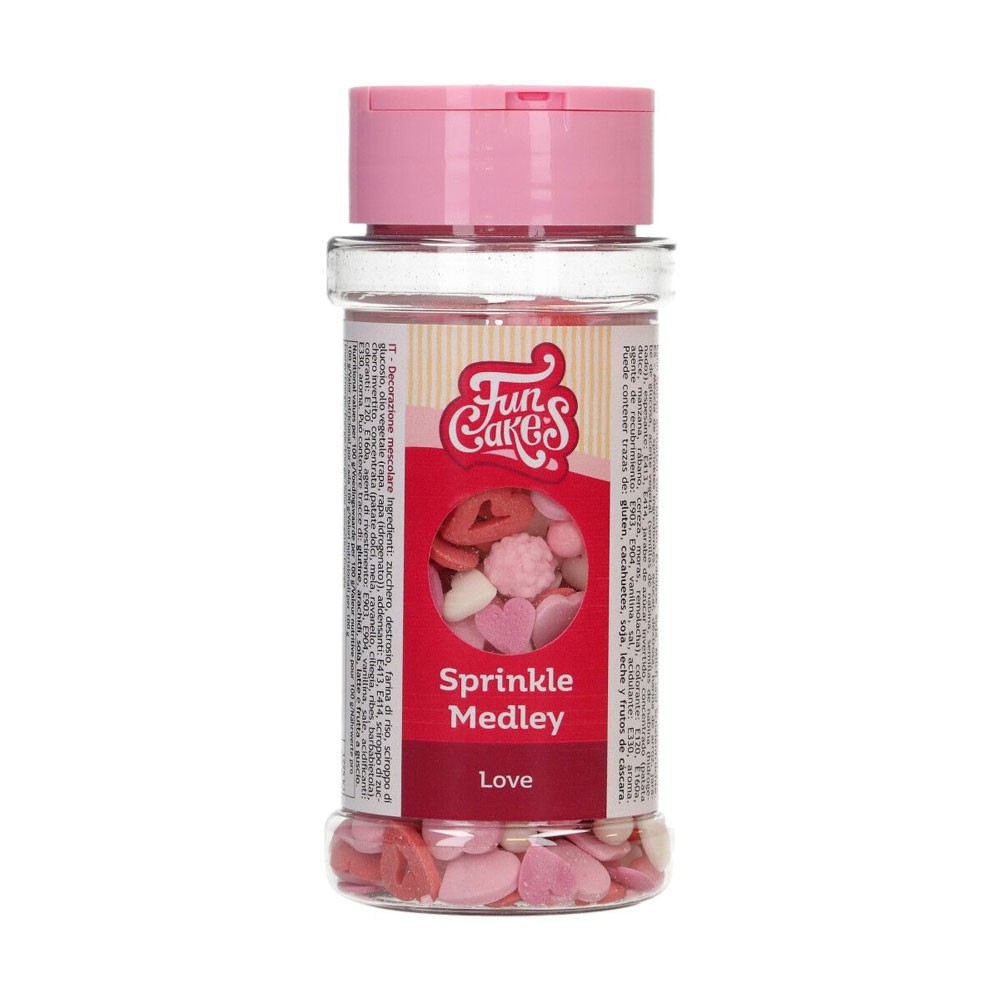 Mezcla de sprinkles Love de FunCakes, ideal para decorar cupcakes, tartas, galletas y postres con temática de amor. Colores blanco, rosa y rojo. Presentado en práctico tarro espolvoreador. Contenido: 50 g.