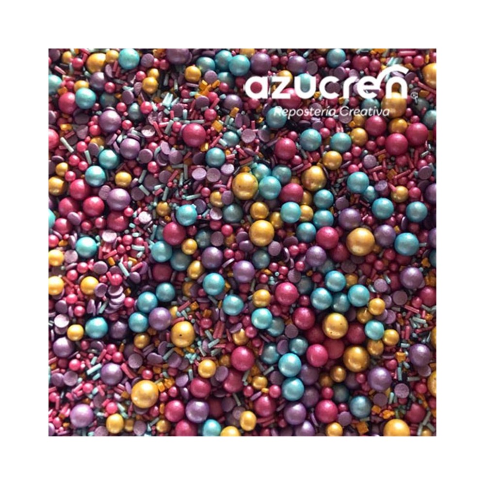 CONTENIDO: FIDEOS ROSA FUERTE, TURQUESA Y NEGROS.CONFETI VIOLETA,CRISTALES ORO, PERLAS 7MMM ROSA FUERTE, TURQUESA, VIOLETA Y ORO;MINI PERLAS ROSA FUERTE.