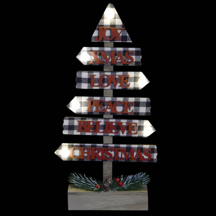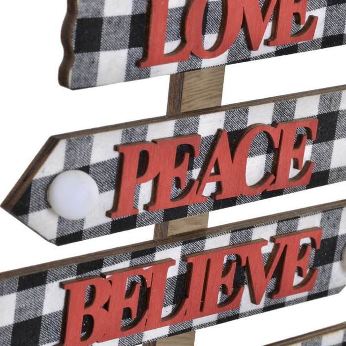 Arbol navideño de estilo alpino formado por listones de madera decorados con cuadros vichy y letreros rojos, ideal para decorar rincones del hogar. El árbol lleva en cada listón una palabra, joy, xmas, love, peace, Believe y Christmas, y una bombilla de luz led. Perfecto como decoración navideña para casa y oficinas.