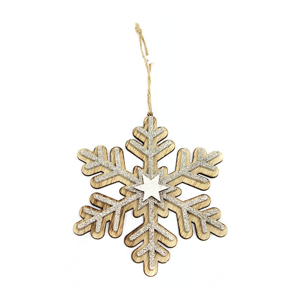Adorno navideño colgante realizado en madera MDF en forma de copo de nieve, ideal para decorar el árbol de navidad en combinación con otras figuras y bolas de navidad.