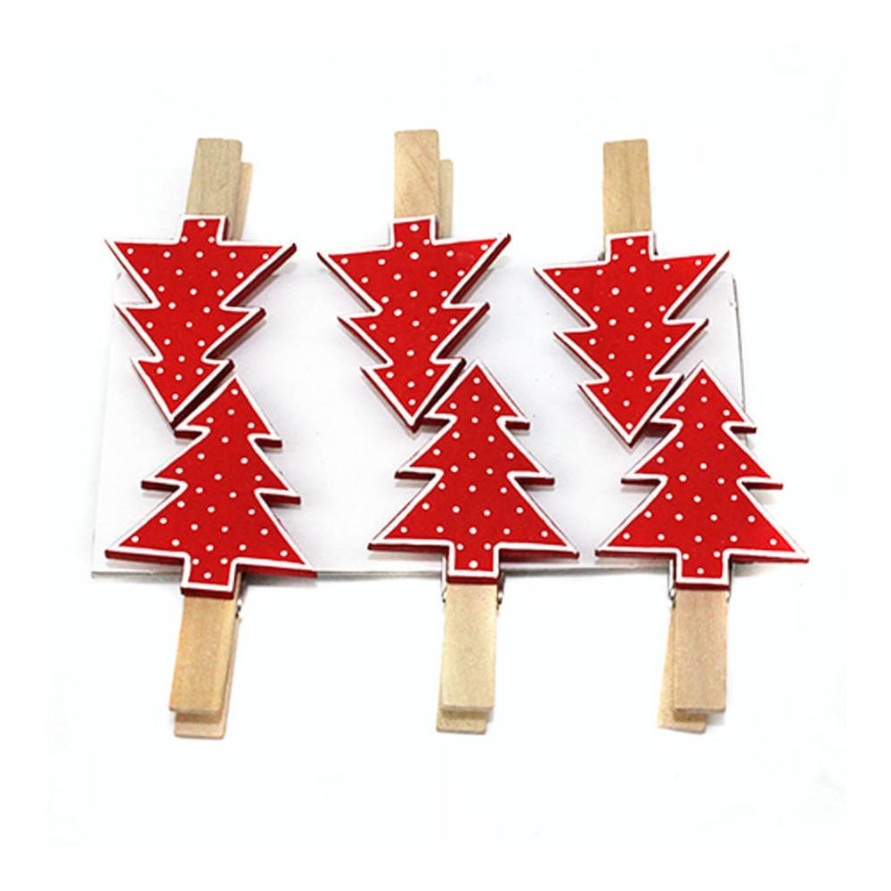 Set con 6 pinzas navideñas realizadas en madera con una figura plana en forma de árbol de navidad en color rojo, ideal para colocar tarjetas con los nombres en la mesa, para decorar las ramas del árbol de navidad, para poner fotografías
