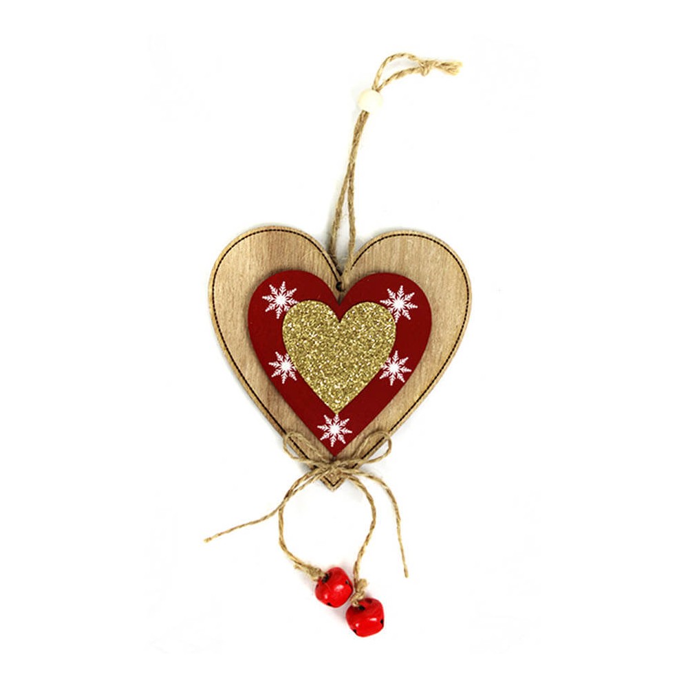 Adorno navideño colgante realizado en madera MDF en forma de corazón, ideal para decorar el árbol en combinación con otras figuras y bolas de navidad.
