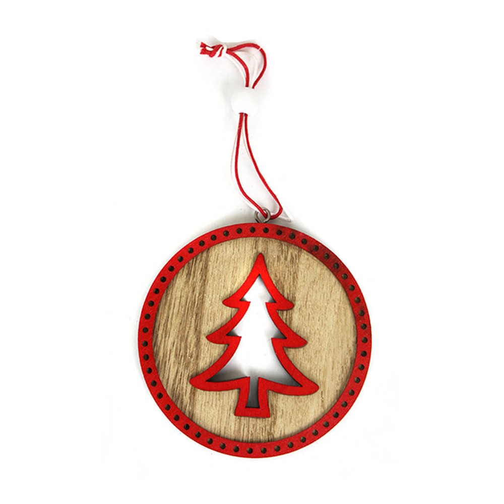 Adorno navideño colgante realizado en madera MDF con forma circular, ideal para decorar el árbol en combinación con otras figuras y bolas de navidad.