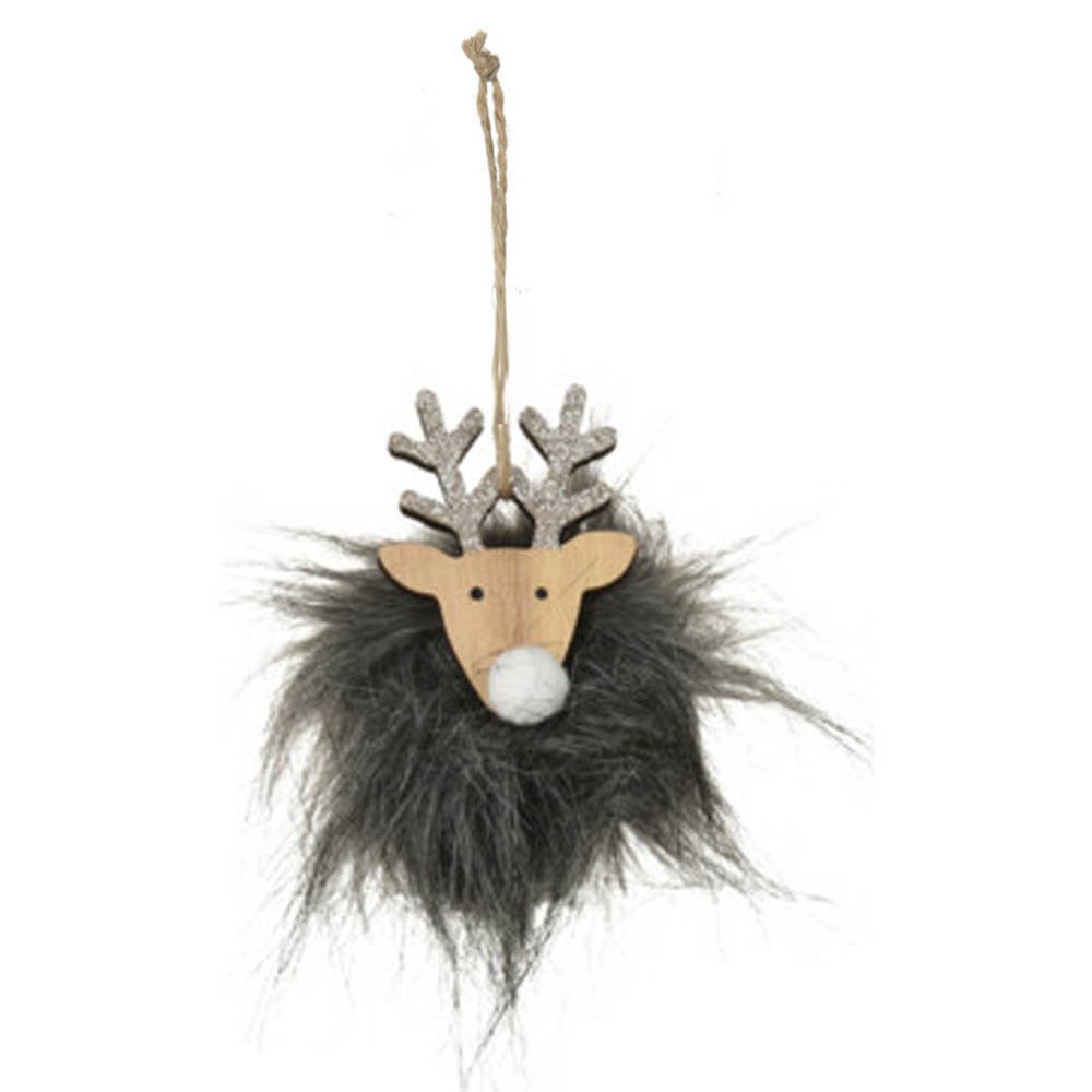 Figura navideña para decorar el árbol de Navidad con un original diseño de pompón con pieza de madera MDF en forma de cabeza de reno. 3 colores, marrón, beige o negro.