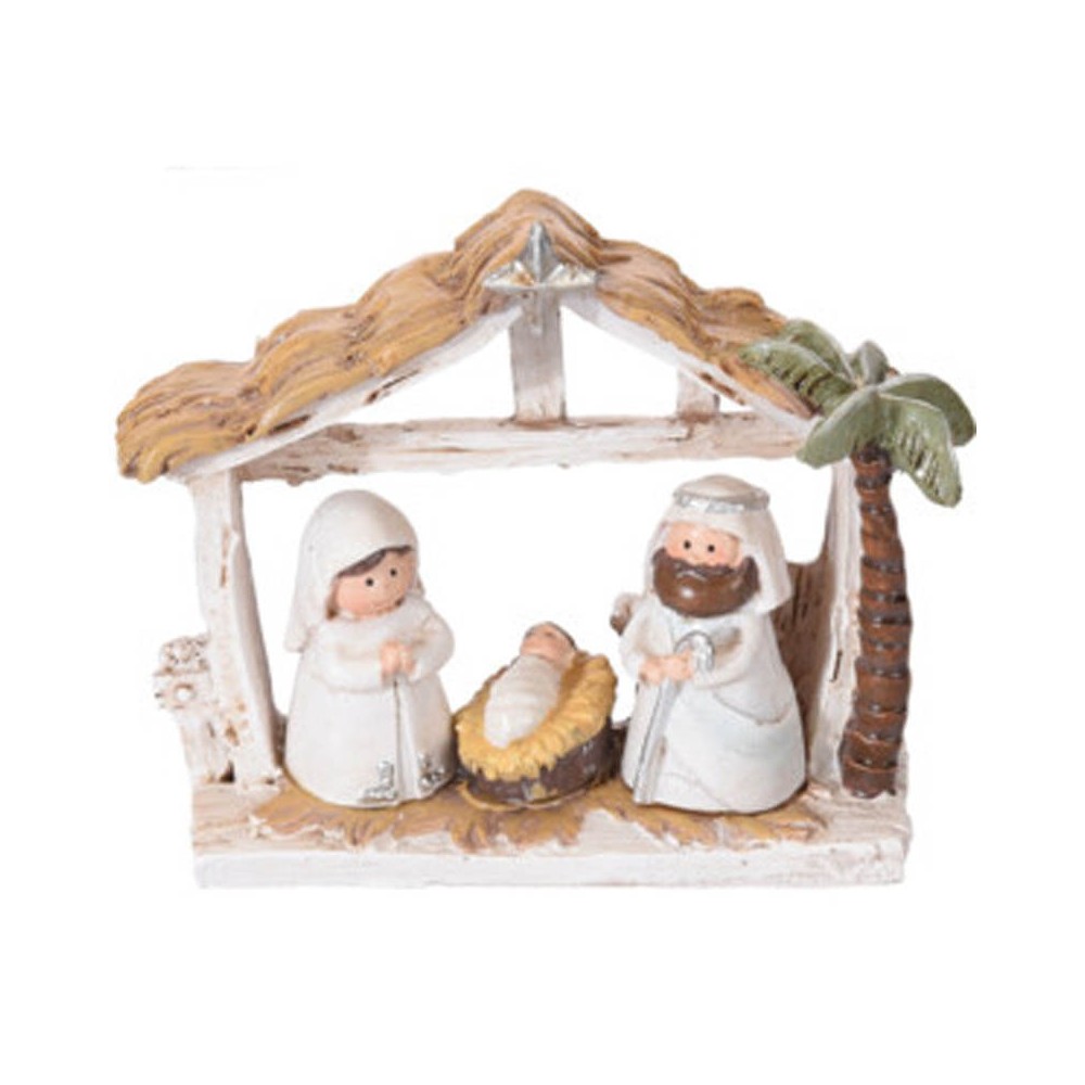 Portal de Belén tradicional con 3 figuras, San José, Virgen María y niño Jesús.