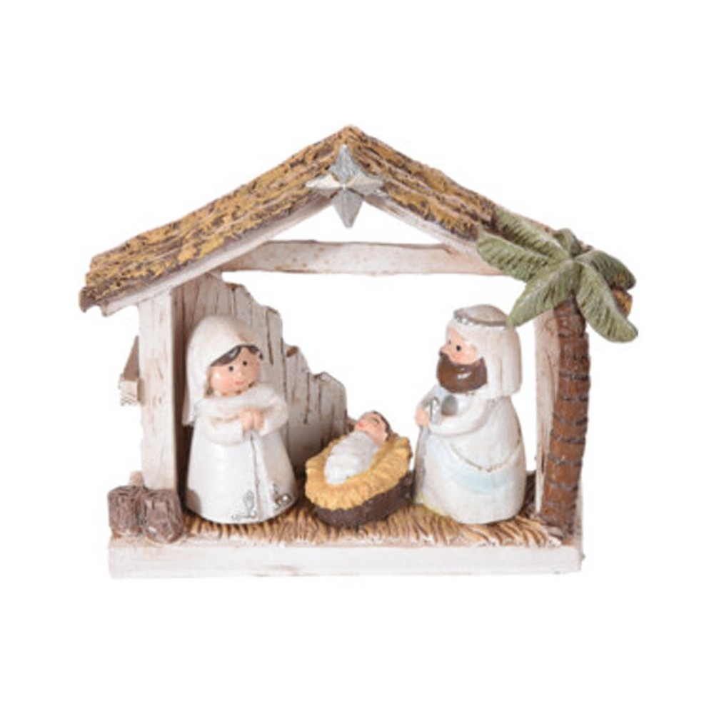 Portal de Belén con San José y la Virgen María adorando al niño Jesus, 3 figuras fabricadas en Polystone, material resistente formado con resina y polvo de piedra.