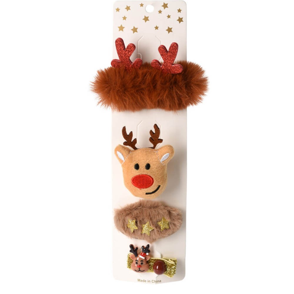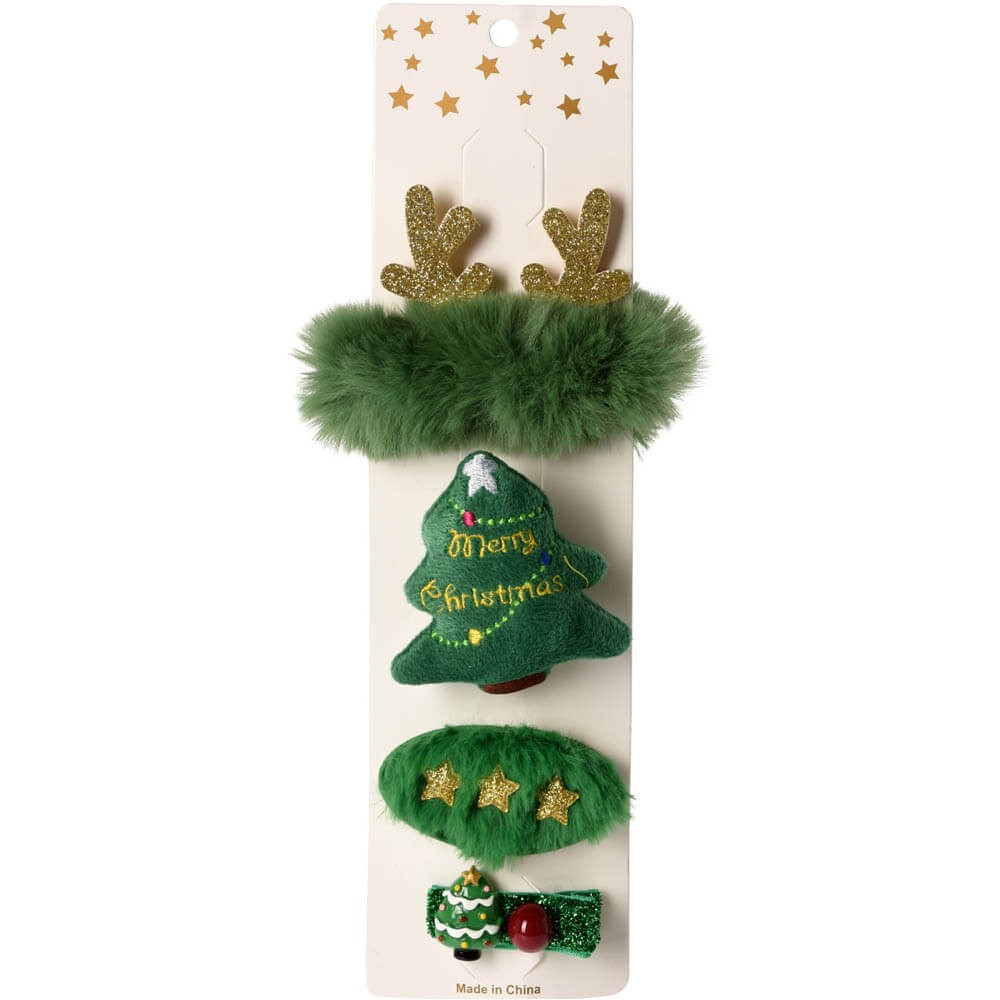 Conjunto de accesorios navideños para el pelo, compuesto por una goma de pelito, un imperdible, un prendedor y una horquilla.