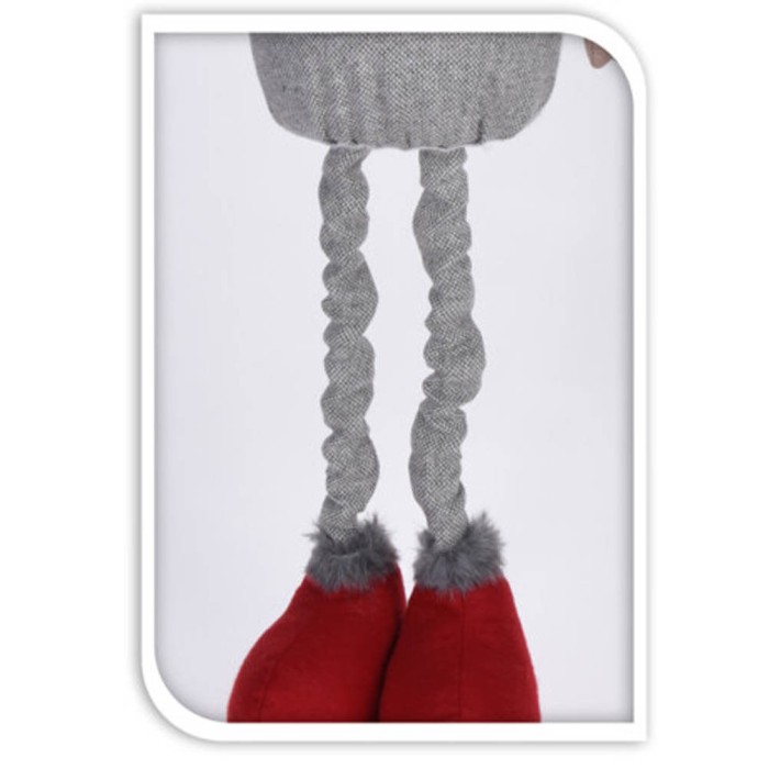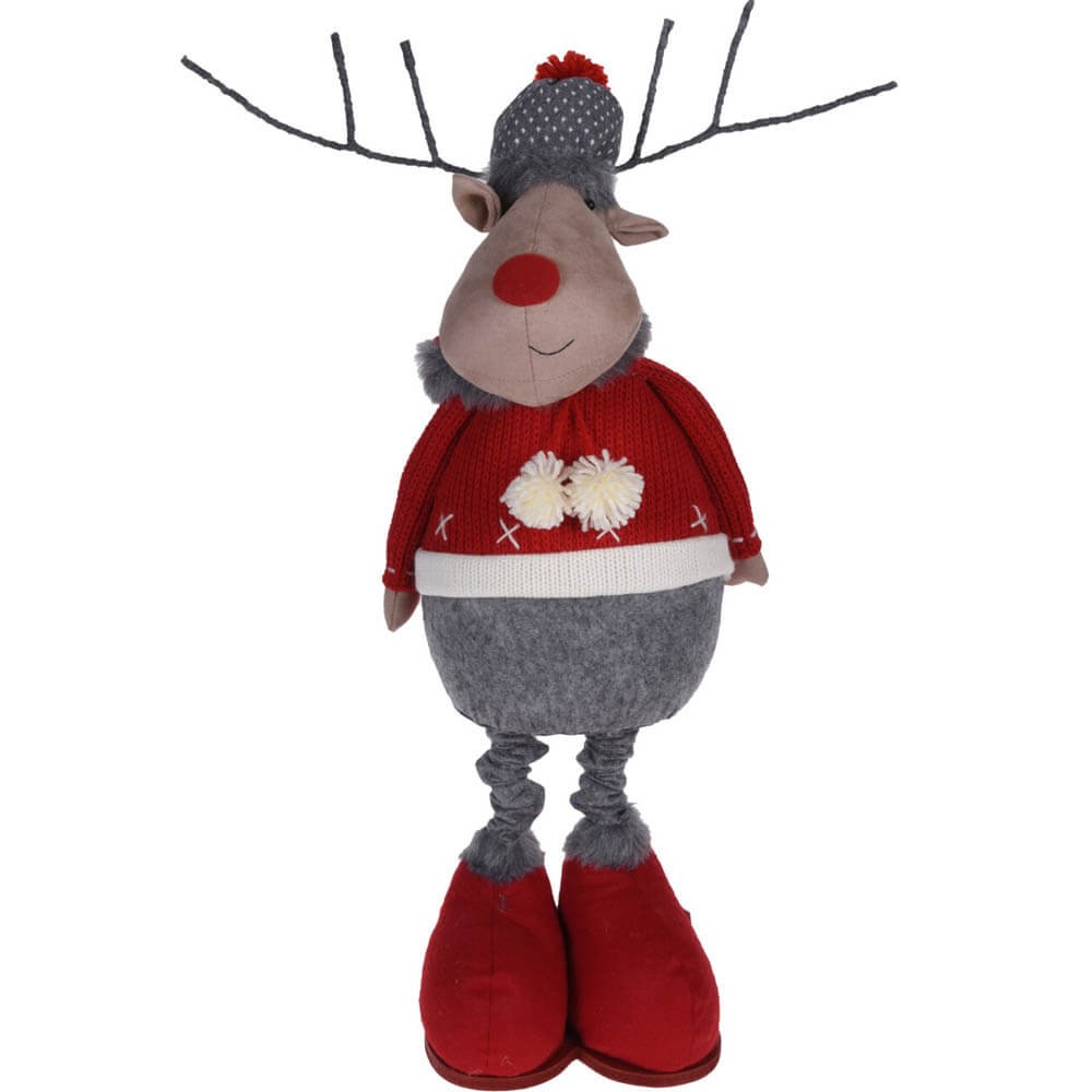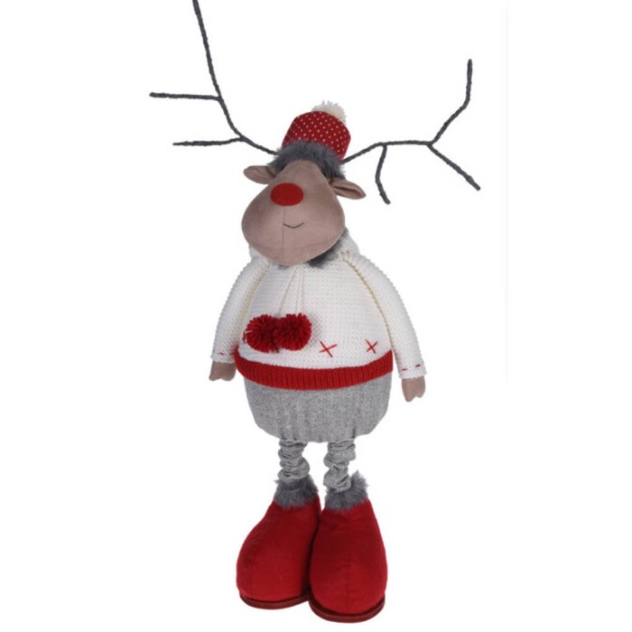 Figura navideña en forma de reno con patas extensibles, fabricado en tejido de poliéster con un diseño alegre en color rojo, blanco y gris, ideal para decorar las diferentes estancias del hogar durante los días de Navidad.
