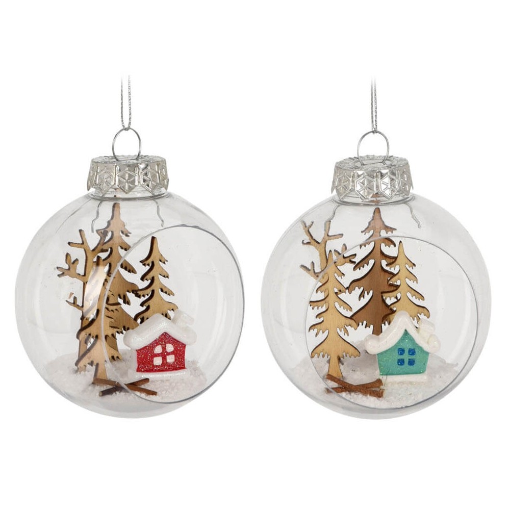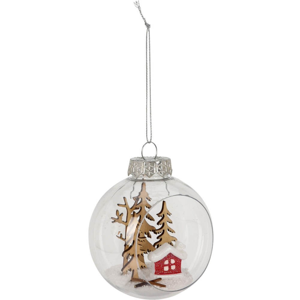 Bola de Navidad de PVC transparente con bonita escena navideña en el interior, árboles de madera MDF y casita roja o azul, un complemento ideal para decorar el árbol de Navidad, incluye cuerda para colgarla fácilmente.