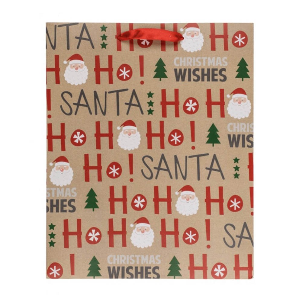 Bolsa de papel con los frontales decorados con una bonita impresión navideña, Papa Noel o regalos. La bolsa cuenta con dos asas rojas realizadas en tejido satinado de color rojo.