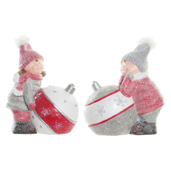 Simpática figura navideña de resina con luz led, diseño niña o niño con bola de navidad en color rojo-gris, perfecta para decorar la entrada de una casa, oficina, negocio, etc.