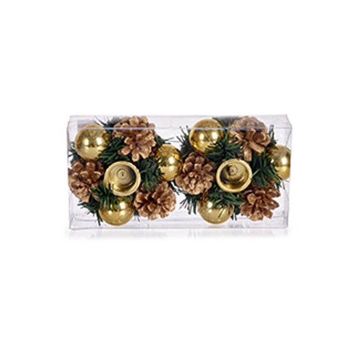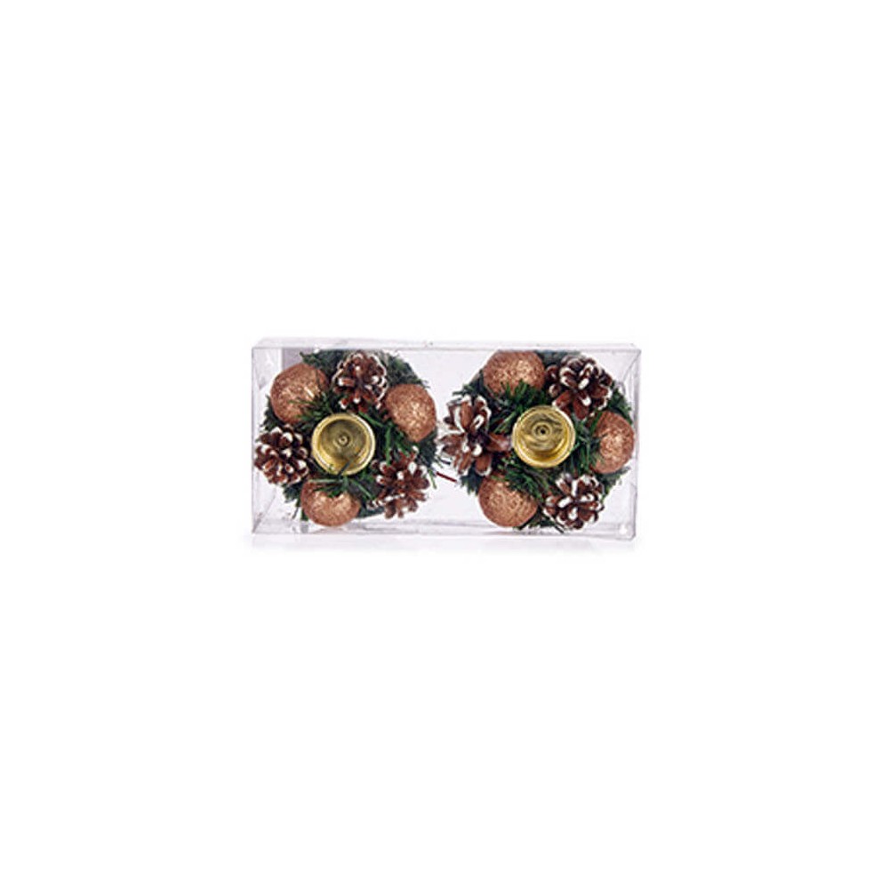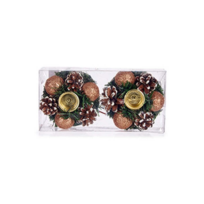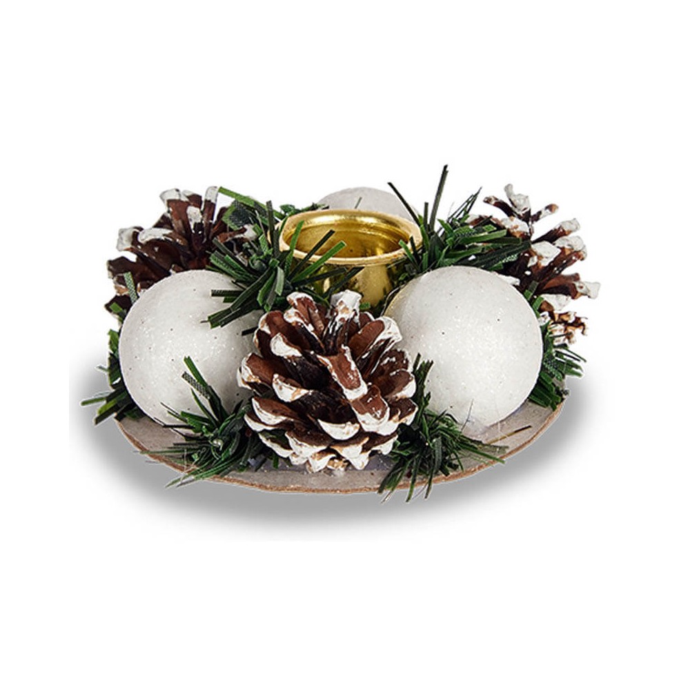 Portavelas navideño decorado con piñas, bolas y ramas de pino, disponible en blanco, cobre o dorado.