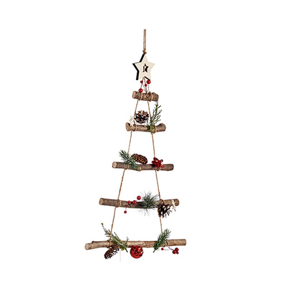 Adorno navideño para colgar en forma de árbol, realizado con 5 ramas de diferentes longitudes en sentido horizontal atadas con cuerda y decoradas con piñas, ramas de pino, bolas rojas y una estrella de madera.