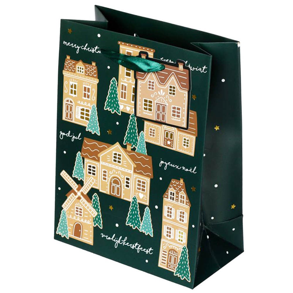 Entrega tus regalos de la mejor manera en esta fantástica bolsa de regalo navidad decorada con maravillosas casitas de jengibre, ideal para sorprender a tus amigos y familiares.