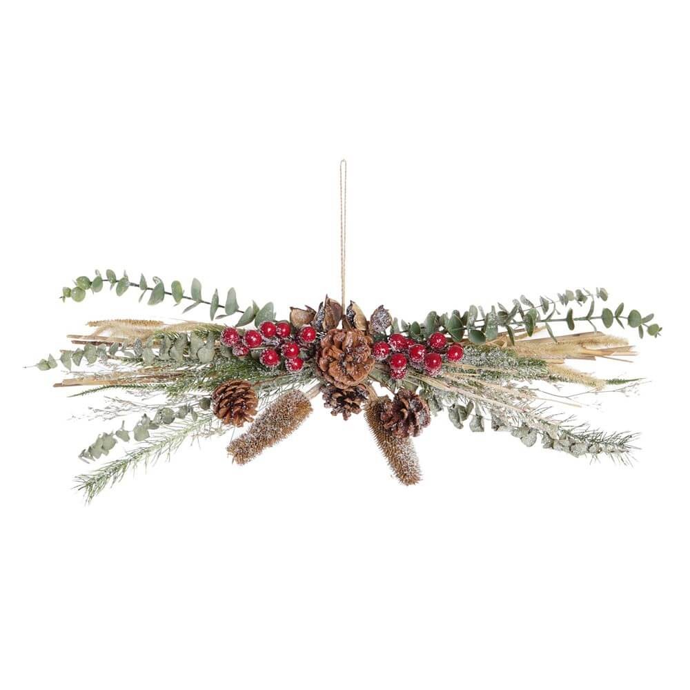 Decoración Navideña tradicional formada por hojas secas, piñas y bayas rojas en forma de ramillete horizontal, ideal para que lo cuelgues de la puerta de entrada consiguiendo un espíritu Navideño, cálido y acogedor para tu casa.
