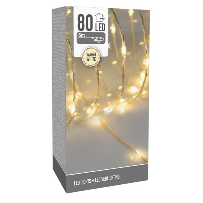 Guirnalda de luces con 80 led en color blanco cálido y cable transparente de 6 metros de longitud, perfecta para que le des un toque íntimo y acogedor a tu hogar iluminando espacios, para fiestas de Navidad y otros eventos. También puedes usarlas en el exterior.