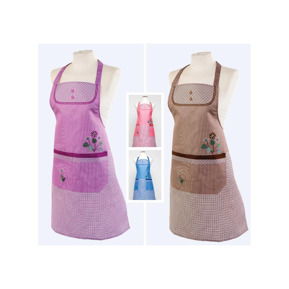 Delantal de cocina para adulto confeccionado en tejido de poliéster con tratamiento antimanchas, diseño campestre en color marrón con estampado de cuadros y flores, lleva un práctico bolsillo frontal para meter objetos personales, un paño de cocina y demás accesorios.