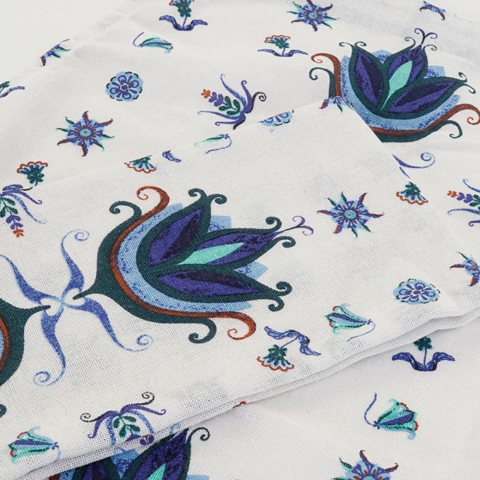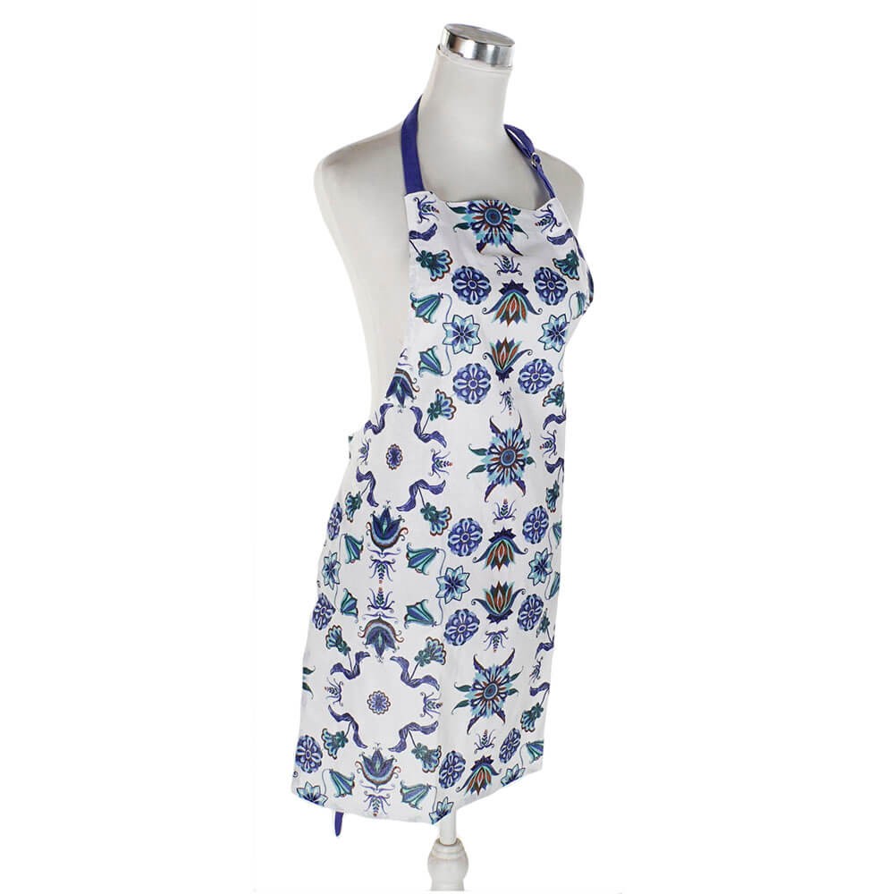 Conjunto compuesto por un delantal de cocina con cintas ajustables al cuerpo para adaptarlo a diferentes alturas y un paño de cocina de sarga, ambas piezas confeccionadas en tejido resistente de algodón 100% con un original estampado en tonos azules que recuerda a los azulejos.