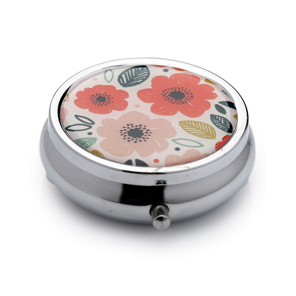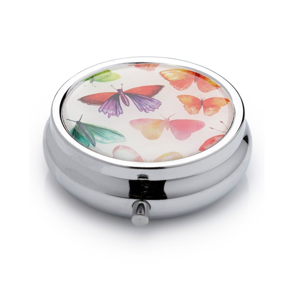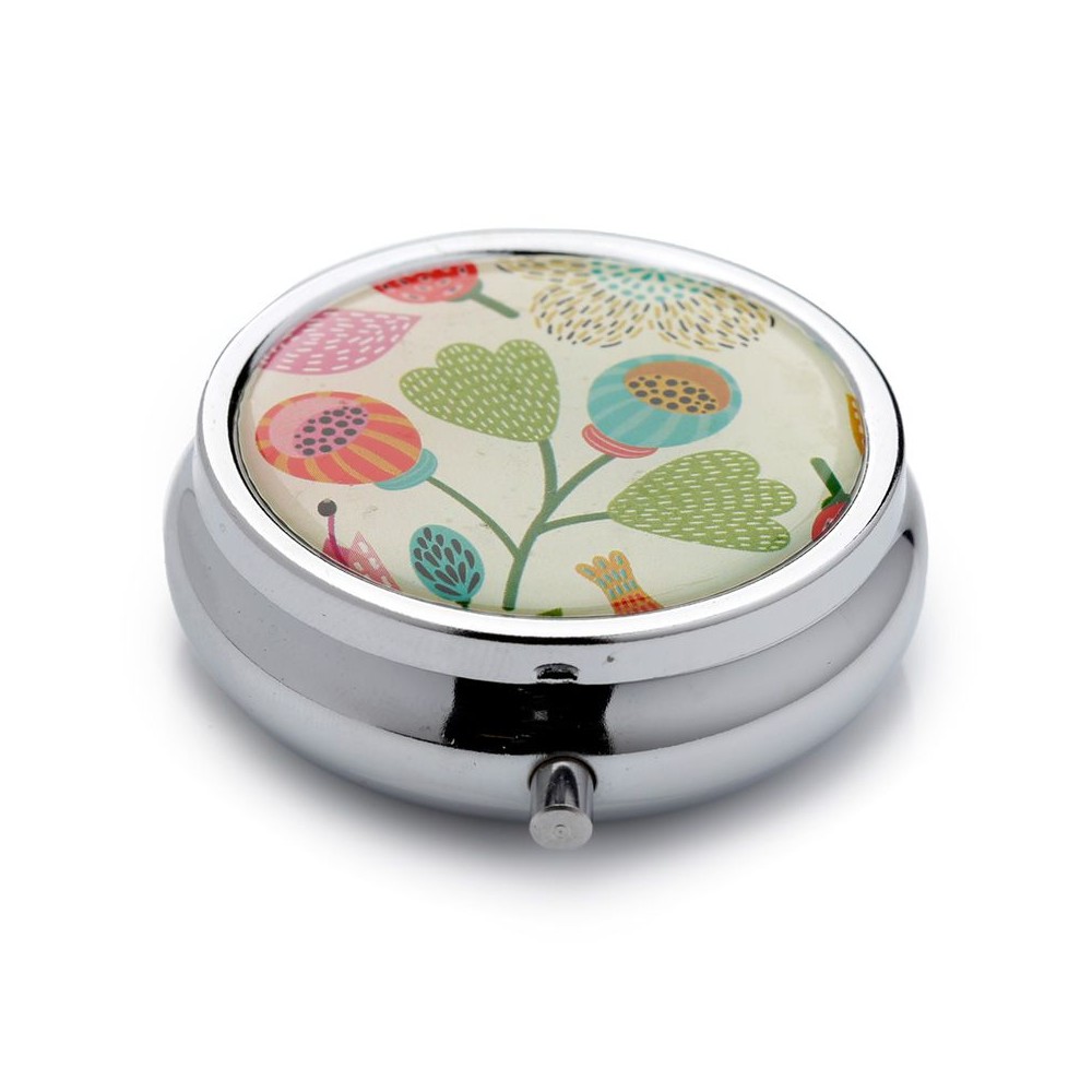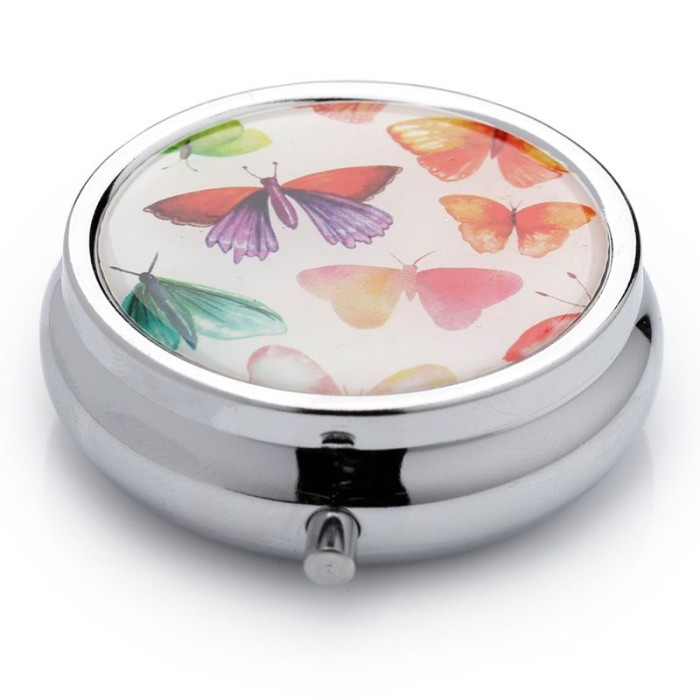 Si buscas un pastillero bonito y que además tenga un calidad excelente estas de suerte, este pastillero metálico fabricado con materiales de alta calidad lleva la tapa decorada con diseños alegres y coloridos, 4 modelos, amapolas, flores, lavanda o mariposas, con la superficie engomada.