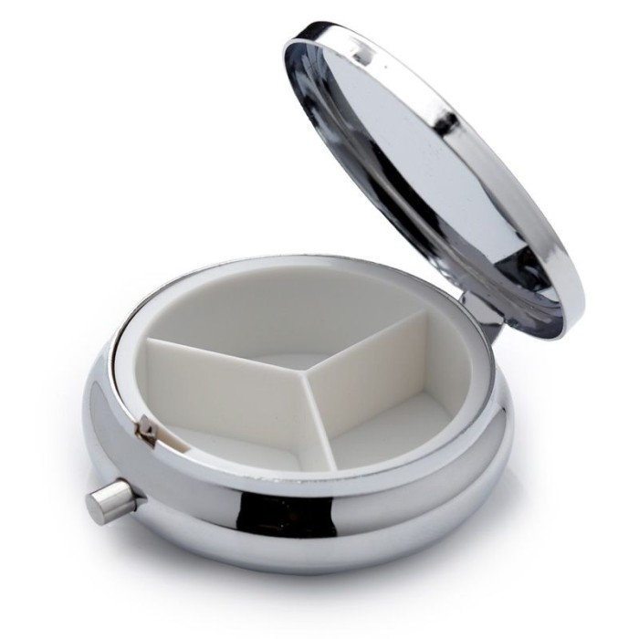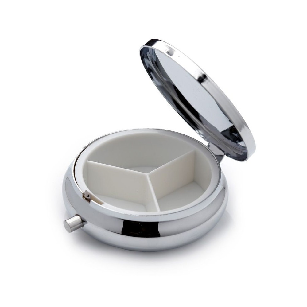 Pastillero diario en formato redondo fabricado en metal resistente con tres prácticos compartimentos en el interior para organizar y separar las pastillas del día, muy útil para aquellas personas que necesiten dividir las pastillas en tres tomas.