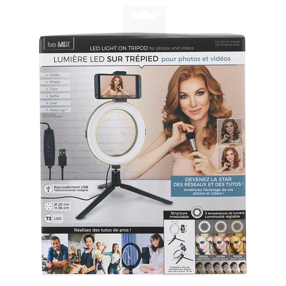 El anillo Led cuenta con 72 LEDs y soporte para smartphones, además dispone de 3 intensidades de brillo para que elija la que más le convenga.