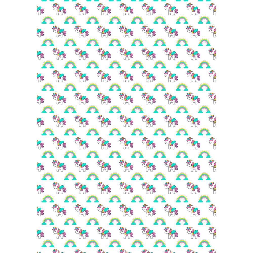 Recibe en tu domicilio o ven a recoger tu impresión en papel de azúcar a una de nuestras tiendas. Un folio de papel de azúcar decorado con unicornios y arcoíris para que decores galletas, cupcakes, tartas y demás dulces.