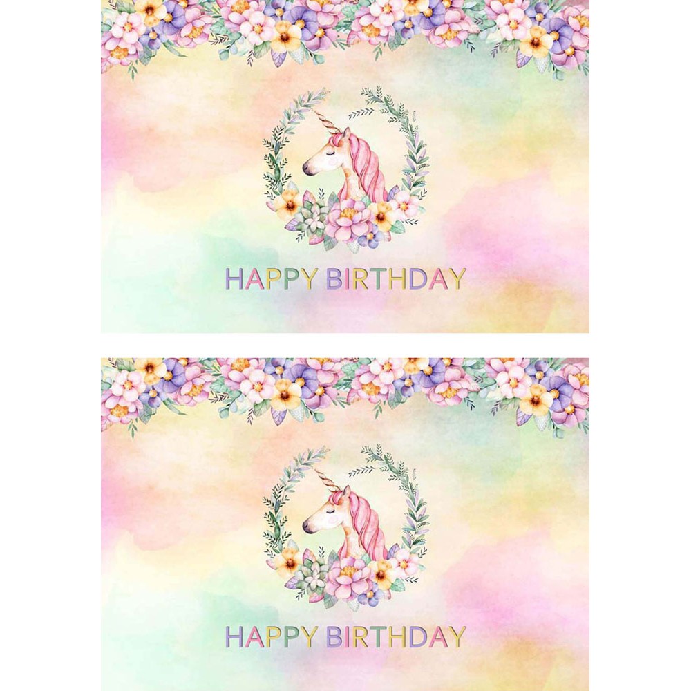 Recibe en tu domicilio o ven a recoger tu impresión en papel de azúcar a una de nuestras tiendas. Un folio de papel de azúcar tamaño A4 con dos rectángulos con el fondo multicolor efecto acuarela decorados con un unicornio, flores y la frase Happy Birthday, ideal para que decores tartas de cumpleaños y demás dulces.