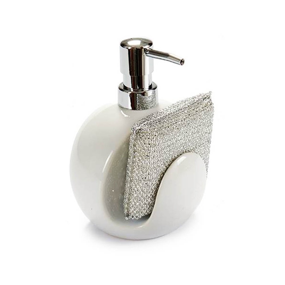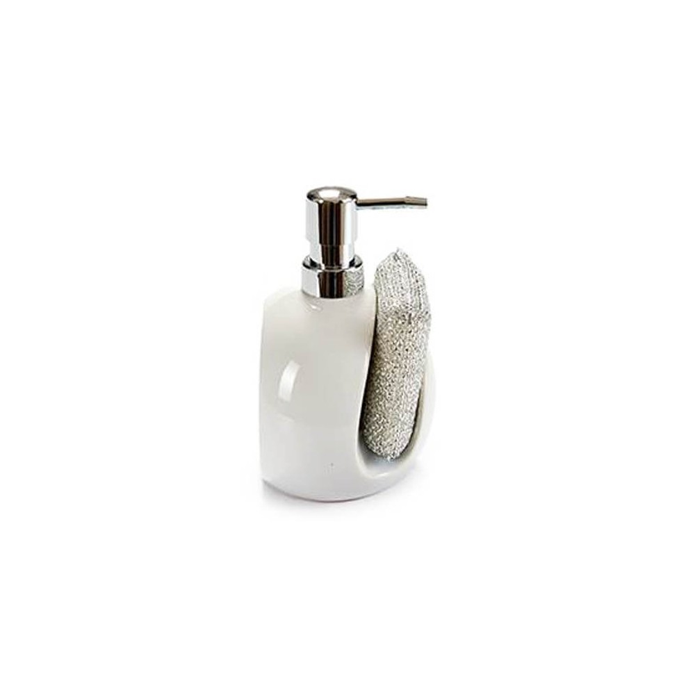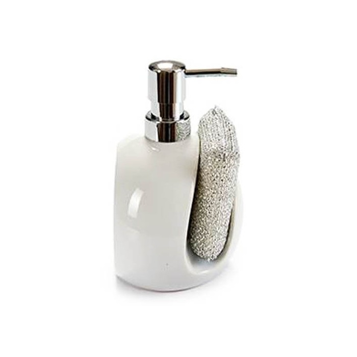 Dispensador de jabón líquido para fregadero realizado en cerámica blanca con soporte para el estropajo, muy práctico para facilitar la tarea de lavar los platos, podrás situarlo al lado del fregadero