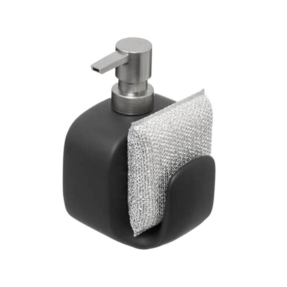 Dispensador de jabón líquido para cocina con espacio para contener una esponja o estropajo, formato redondo o rectangular fabricado en cerámica de color negro con cabezal cromado.