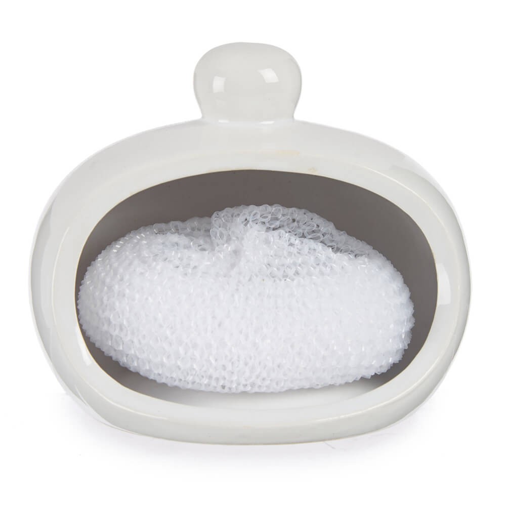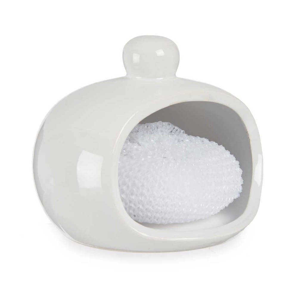 Estropajero de cerámica blanca, diseño sencillo y redondeado. Ideal para guardar esponjas o estropajos. Medidas: 12 x 10,5 x 9,8 cm.
