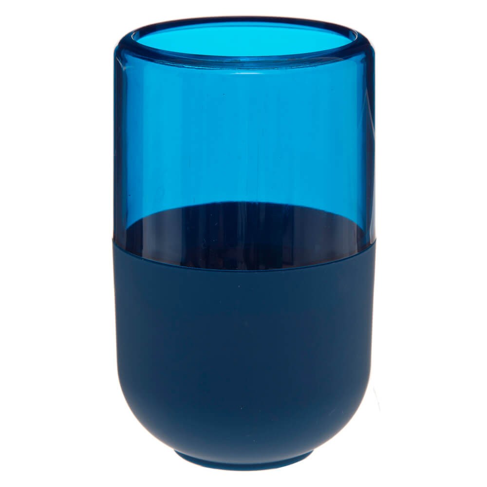 Vaso para baño realizado en poliestireno resistente de color azul, un recipiente ideal como portacepillos de dientes. El vaso tiene un diseño sencillo de líneas redondeadas con acabado translucido en la parte superior y opaco en la base. Su diseño sencillo en color liso lo convierte en una pieza fácilmente combinable con otros accesorios de baño.