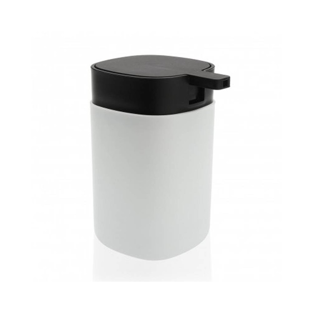 Dispensador de jabón líquido para lavabo realizado en polipropileno resistente de color blanco con cabezal negro. Diseño bicolor en formato cuadrado con las esquinas redondeadas.