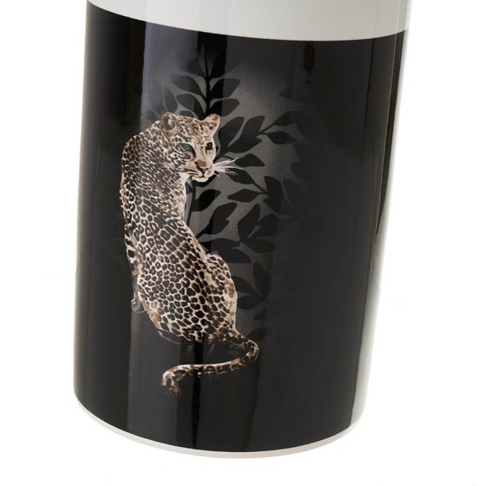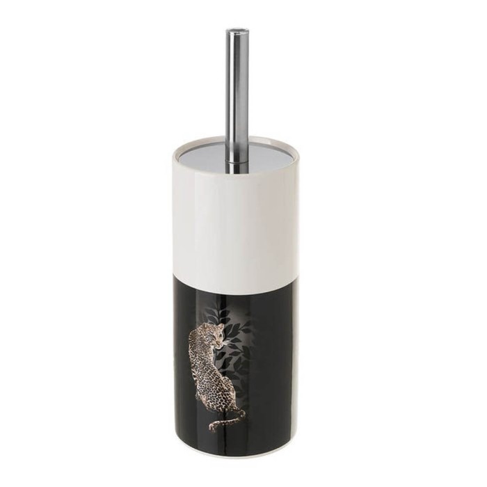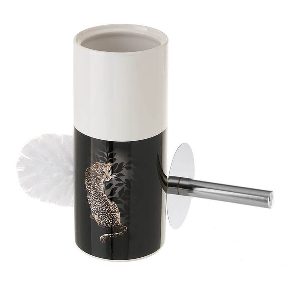 La escobilla wc incluye soporte cilíndrico realizado en cerámica resistente bicolor, negro y blanco, con la imagen de un leopardo sobre fondo negro con hojas, indispensable para contener la escobilla y poder situarla al lado del inodoro.