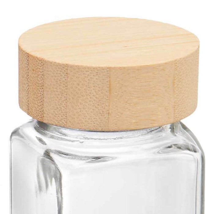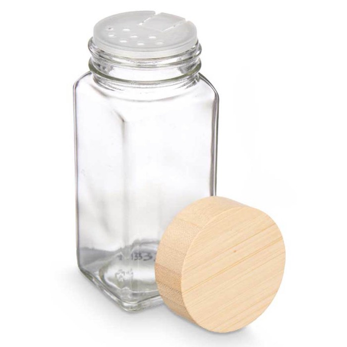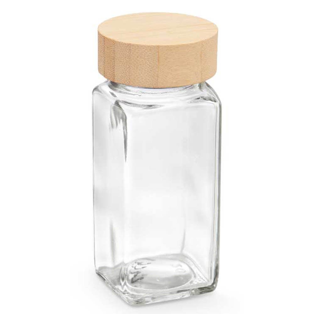 Especiero de cristal con tapa de bambú y tapón perforado. Perfecto para conservar especias y organizar la cocina. Medidas: 4,5 x 4,5 x 11 cm.