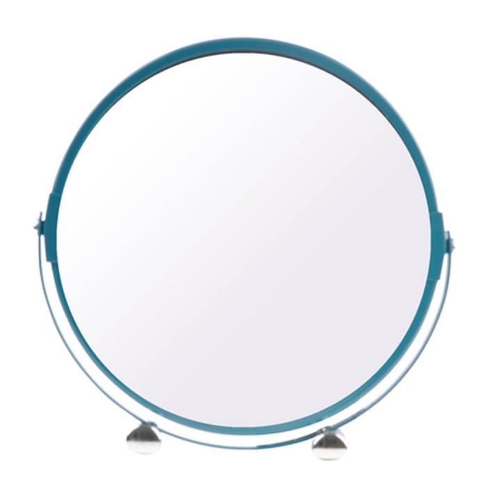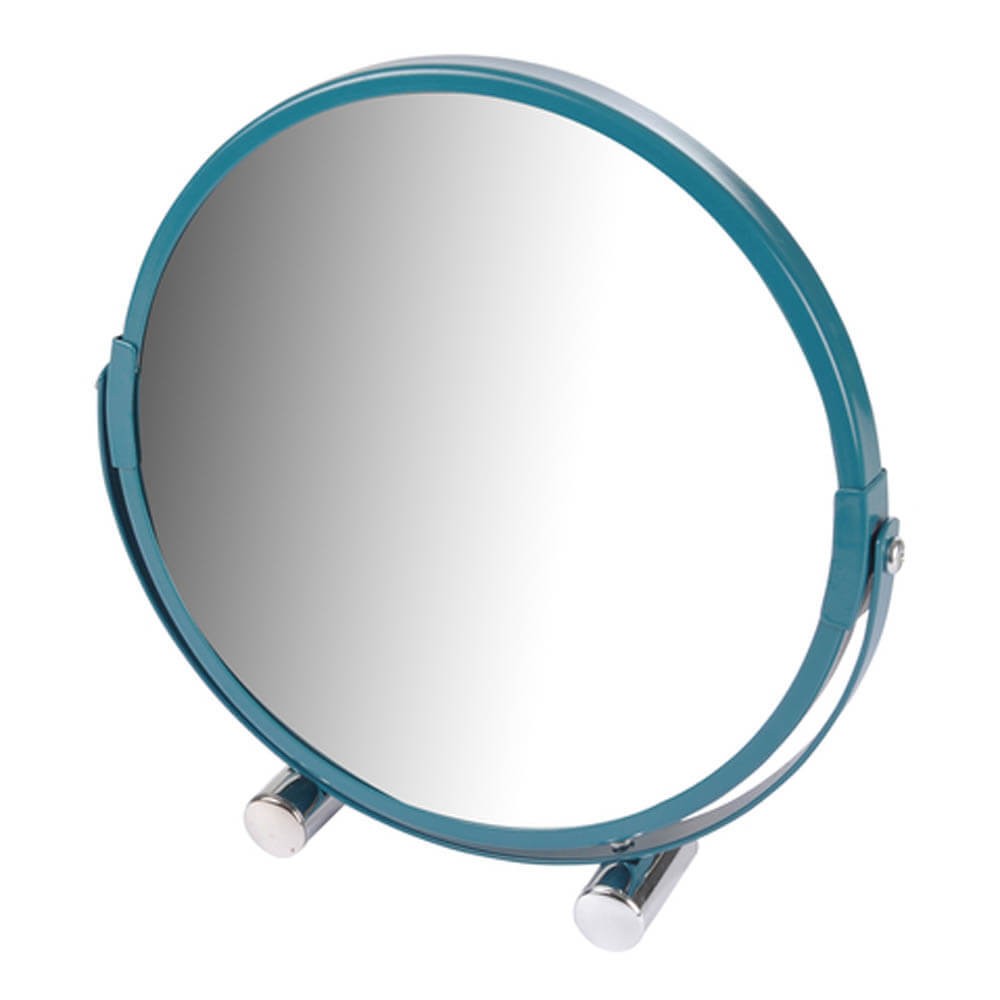 Espejo de aumento con marco metálico de 17cm de diámetro en color azul, lleva base con dos patas tubulares en color plata.