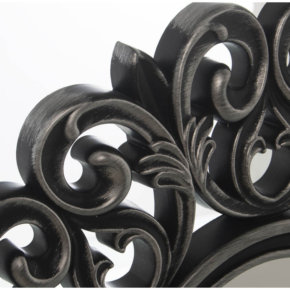 Espejo decorativo redondo de estilo rococo con el marco realizado en melamina de color gris oscuro con patina plata, un espejo de estilo clásico perfecto para decorar paredes del hogar.