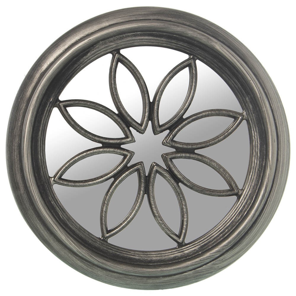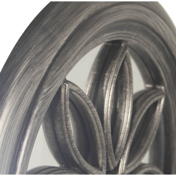 Espejo redondo con el marco realizado en melamina de color gris con patina plata. Un espejo decorativo con 8 piezas en su interior en forma de flor, su diseño es perfecto para decorar paredes del hogar, ideal para colgar en la entrada, salón o dormitorio.