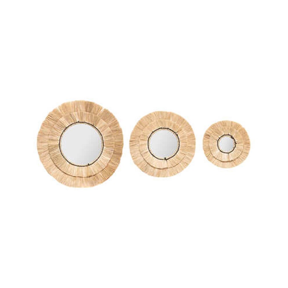 Conjunto compuesto por 3 espejos redondos para pared de vidrio con estructura de hierro y marco fabricado en fibra natural de rafia, el accesorio ideal para decorar recibidores, salones, dormitorios y demás estancias del hogar aportando un toque natural y desenfadado.